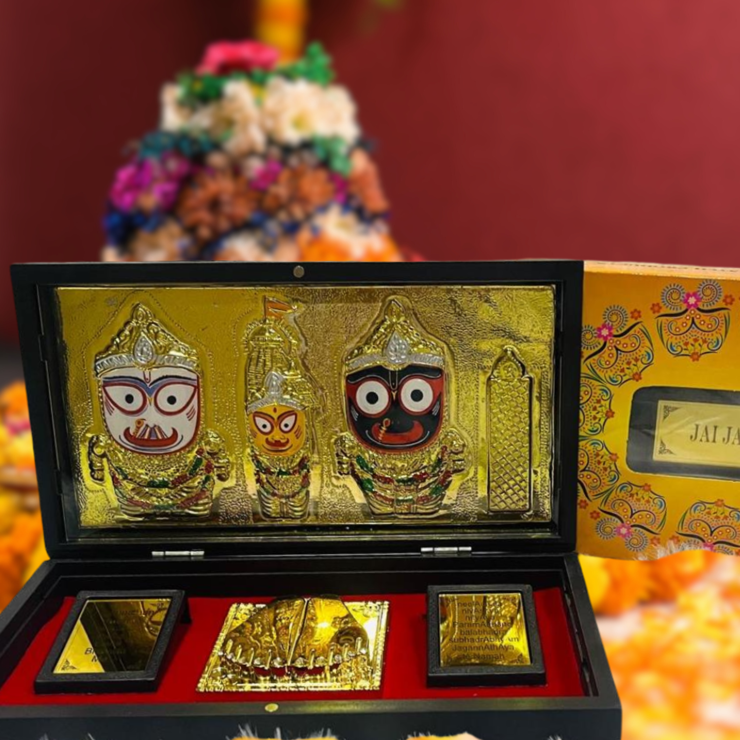 Lord Jagannath Gold-Plated Idol with Silver base & Charan Paduka in Divine Brown Case – Premium Pooja and Gift set