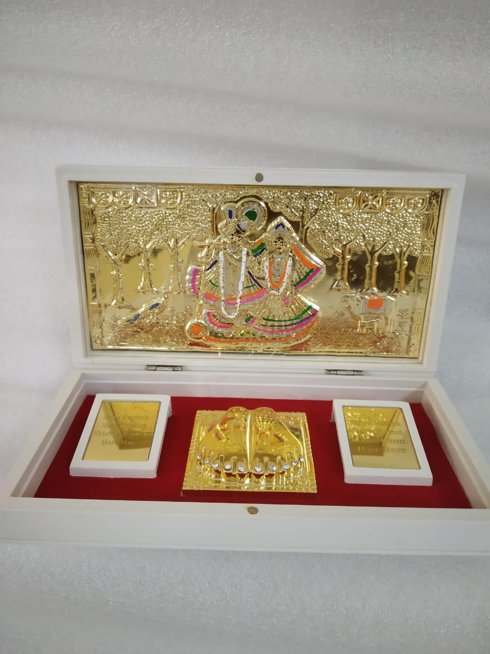 ✅ Premium Craftsmanship: Elegant wooden box (Size: 8 x 5 inches) with silver base & gold-plated Radha Krishna artwork.